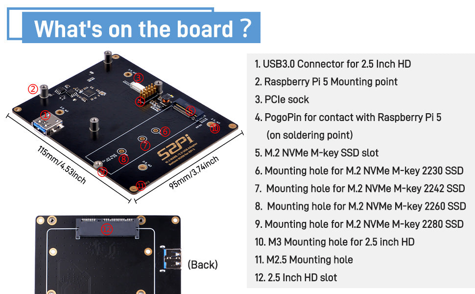 NU08 M.2 NVMe + 2.5 USB HDD Bottom is a Raspberry Pi 5 PCIe Expansion Board, It is an innovative add-on designed to enhance the capabilities of your Raspberry Pi 5. With this expansion board, you can connect various peripherals to your Raspberry Pi 5 via its PCIe interface, expanding its functionality and storage capacity. With a SATA slot for 2.5 inch HD(hard disk) connect to Raspberry Pi 5's USB3.0 port with a USB connector. And at the same time, you can attach a M.2 NVMe M-key SSD to M.2 slot, supports size: 2230/2242/2260/2280.