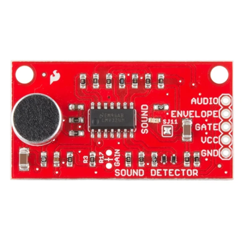 The SparkFun Sound Detector is a small and very easy to use audio sensing board with three different outputs. The Sound Detector not only provides an audio output, but also a binary indication of the presence of sound, and an analog representation of its amplitude. The 3 outputs are simultaneous and independent, so you can use as many or as few as you want at once.
