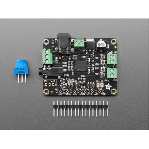 - We like the MAX9744 amplifier at the heart of this board because its very easy to use, but it also has both analog and digital volume control capability. Use a single 1KΩ pot (we include one) to adjust volume analog-style. Or hook it up to your favorite microcontroller and send I2C commands to set 64-steps of volume amplification.