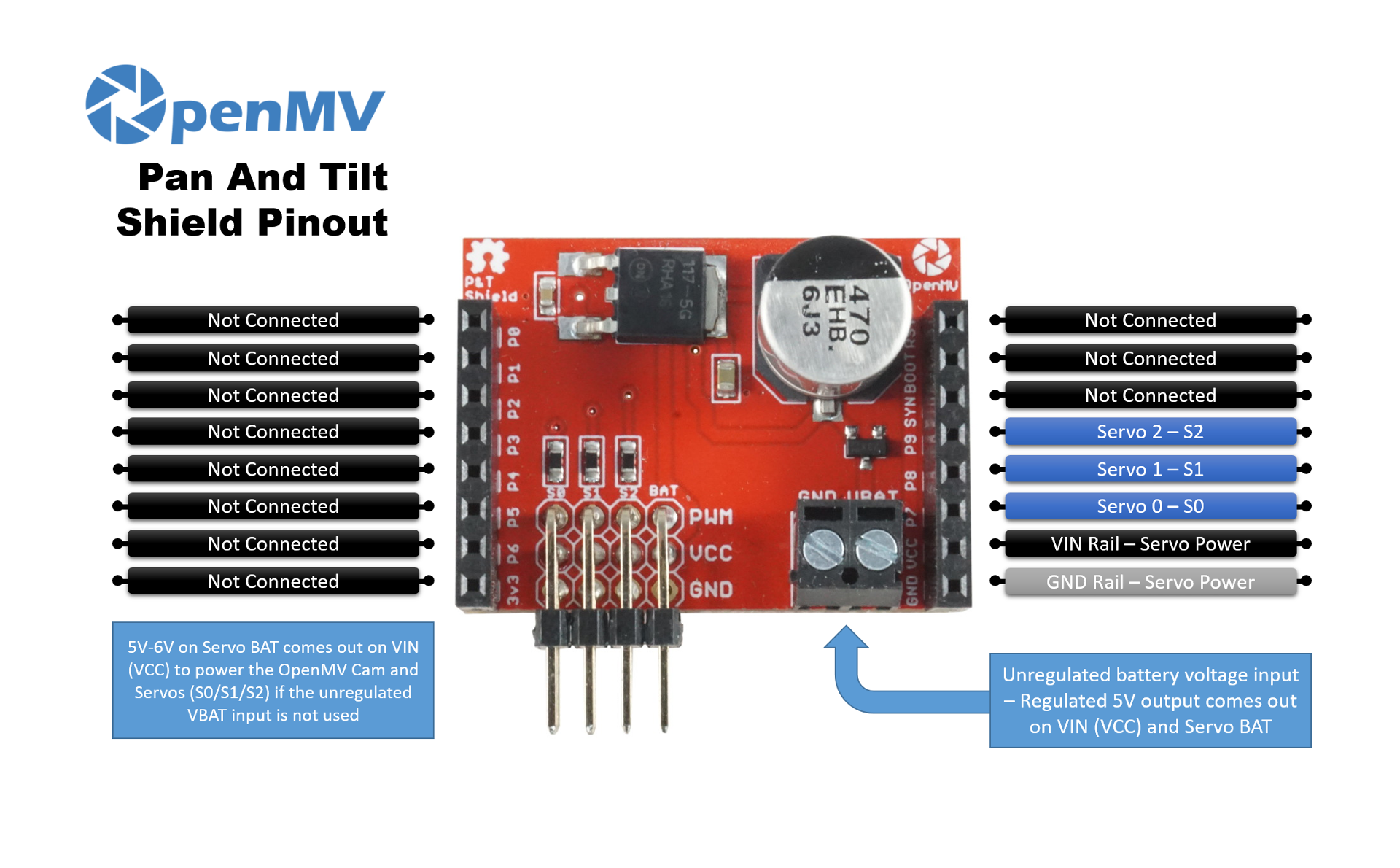 - Power your OpenMV Cam via using an unregulated battery by regulating the battery voltage down to 5V along with providing 5V to all four servo headers.