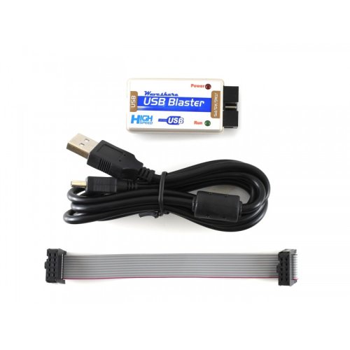 Waveshare USB Blaster Download Cable, compatible with ALTERA USB Blaster FPGA/CPLD programmer. The USB Blaster Download Cable interfaces a USB port on a host computer to an Altera FPGA mounted on a printed circuit board. The cable sends configuration data from the PC to a standard 10-pin header connected to the FPGA. You can use the USB Blaster cable to iteratively download configuration data to a system during prototyping or to program data into the system during production.